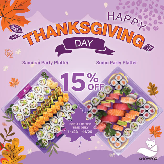 Celebrate the season with 15% off our Samurai and Sumo Party Platters from November 23 – November 29 at participating SNOWFOX locations, including Hannaford, WinCo, Ninos, Hugo’s, ShopRite, Albertsons, Safeway, Weis Markets, and SaveMart. Perfect for sharing with family and friends!