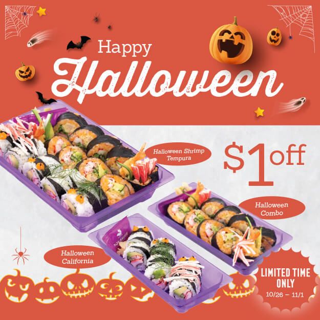 For a limited time, enjoy $1 off our Halloween Specials from October 26 – November 1 at participating Festival Foods locations nationwide. Treat yourself to our seasonal favorites, including the Halloween Shrimp Tempura, Halloween Combo, and Halloween California Roll.