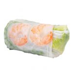 Rice paper filled with cocktail shrimp, rice noodles, lettuce, and cucumber