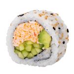 Long kani, avocado, cucumber, and nori topped with spicy mayo, shichimi, and sesame seeds