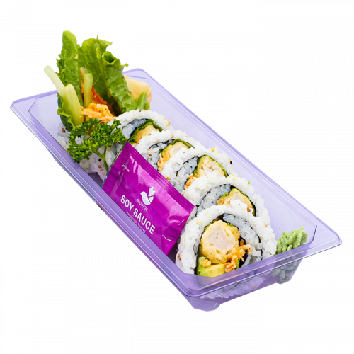 Tempura shrimp, surimi salad, avocado, cucumber, lettuce, and nori topped with sesame seeds